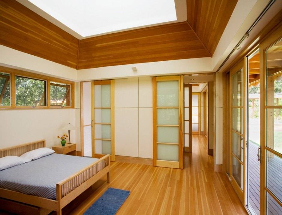 Спальни в японском стиле предпочитают тонкий и мягкий свет. Это создает правильное настроение и атмосферу для их интерьеров. Гениальное решение — поместить темно-коричневые жалюзи на деревянные окна. Это позволяет осуществить любую регулировку интенсивности света. Данное решение — отличная альтернатива для тех, кому не нравится, когда в комнате всегда темно.