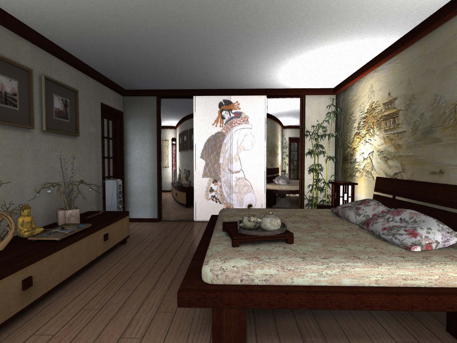 Часто в интерьере спальни в японском стиле есть одно характерное дополнение. Обычно это большая картина, висящая над кроватью. Ее тема строго связана с природой или японскими символами.