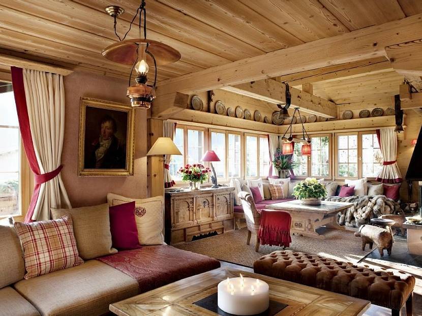 - Если речь идет о портьерах, то подвязки в виде тесьмы или люверсов будут идеально гармонировать с деревянными стенами из бруса.