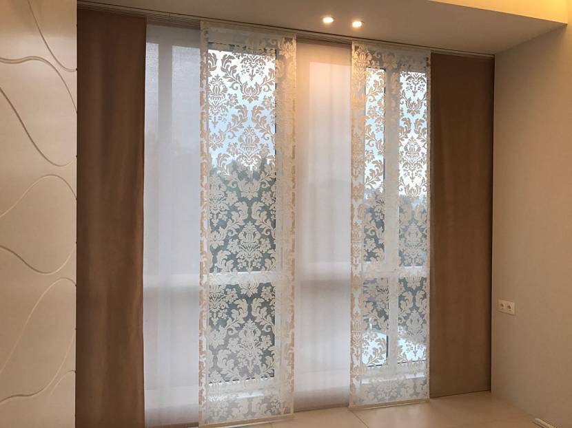 Для большей практичности или необычных и интересных визуальных решений можно сочетать японские шторы из разных материалов между собой или комбинировать их с другими вариантами оформления окон и дверных проемов.