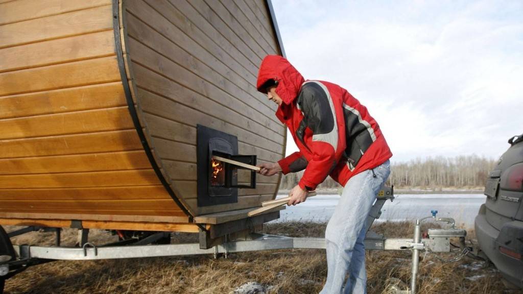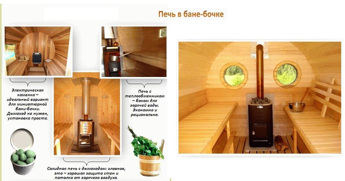 Можно использовать разные виды отопительных приборов. Печь может находиться как внутри помещения, так и снаружи. Как вариант – котел на дровах, который располагается внутри бани-бочки, но топка размещена снаружи, и поленья забрасываются с улицы.