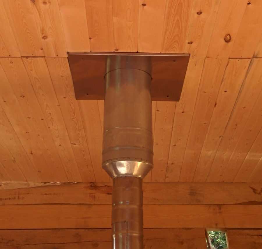 - Шаг 5. Крепим стропила и покрываем крышу. Через перекрытие делаем проход трубы – его легко изготовить из металлического уголка и листа нержавейки.