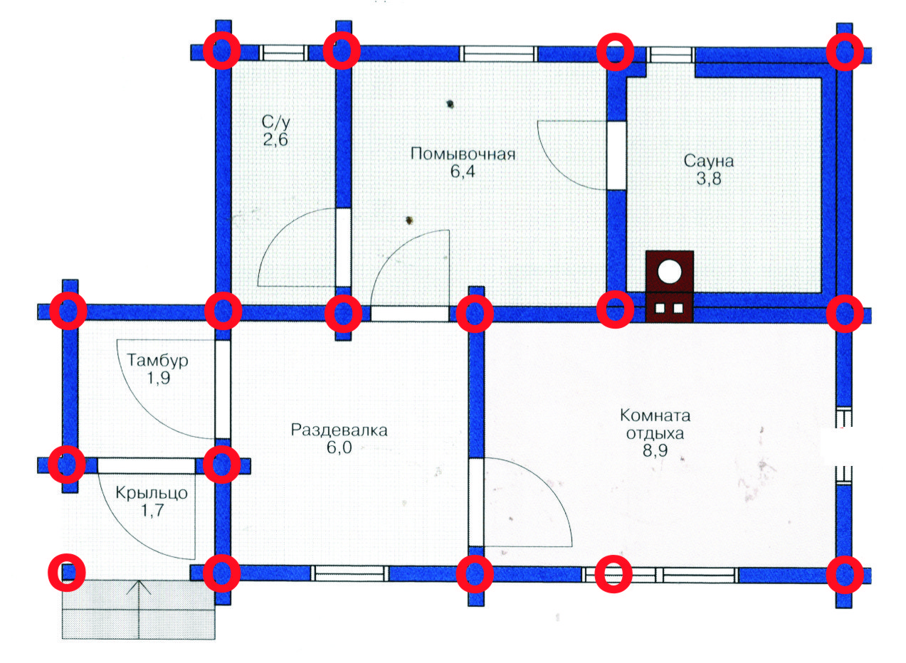 Все опоры следует установить в ключевых местах. К ним относятся те места, где происходит соединение простенков, а также под углами основания.