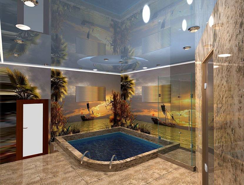 В интерьере этой бани «зеркало» бассейна как бы служит продолжением южного моряИсточник eventology-theory.ru