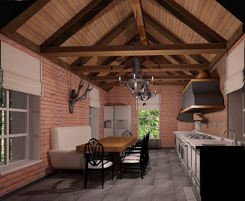 Интерьер кухонной зоны предполагает наличие полноценных секций в виде необходимых коммуникаций, оснащения бытовой техникой, печкой и т.д. Рекомендуется продумать максимально удобное размещение этих блоков при приготовлении разнообразных блюд и консервации запасов на зиму. Строение предназначено для летнего отдыха, поэтому стоит обеспечить хозяйке условия для легкой непринужденной готовки, кардинально отличающейся от работы на кухне в квартире. Пусть приготовление пищи на свежем воздухе будет реальным отдыхом, а не мучением с перетаскиванием тяжелых ведер и замерзанием рук от ледяной воды.