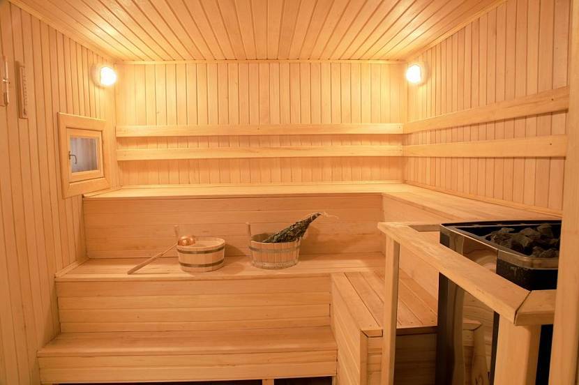Каменка из нержавейки, электрическое освещение и термометр на стене – современные атрибуты в традиционной парилкеИсточник stroyassortiment.ru