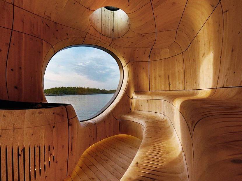 Если уж говорить об изогнутых формах, то парная обшитая панелями из «гнутого» дерева сделает любую баню ультрасовременной.
