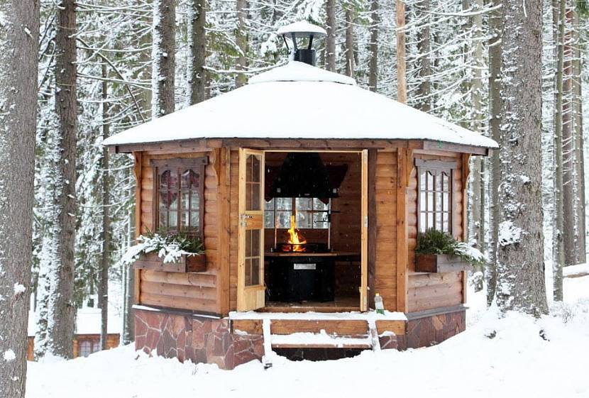 - беседку можно разделить на две зоны, каждая из которых может выполнять свою роль. Одна половина пространства может быть обустроена под столовую, а вторая использоваться в качестве поленницы. Конечно, такой вариант планировки подходит в том случае, если площадь, отведенная под беседку, имеет достаточно большие размеры;