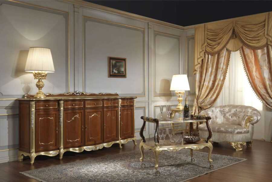 Для этого активно использовалась ажурная лепнина, позолота и дорогой текстиль. При помощи сложных драпировок создавалось красивое оформление больших оконных проемов. Чтобы верхняя часть крепления ткани не бросалась в глаза, ее стали прикрывать жесткими ламбрекенами. Они хорошо держали форму, полностью скрывали под собой карниз, помогали создавать четкую линию, которая так хорошо вписывалась в общую стилистику оформления.
