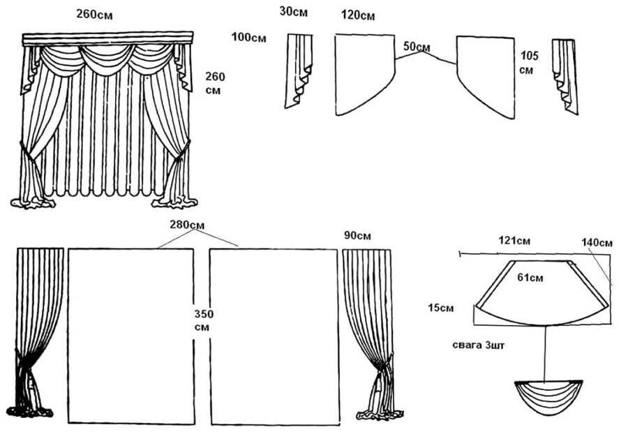 Формирование драпа может происходит по разной схеме, от чего зависит пышность оконного проема. Всего существует 6 разновидностей драпировки, которые имеют разные складки и формы.