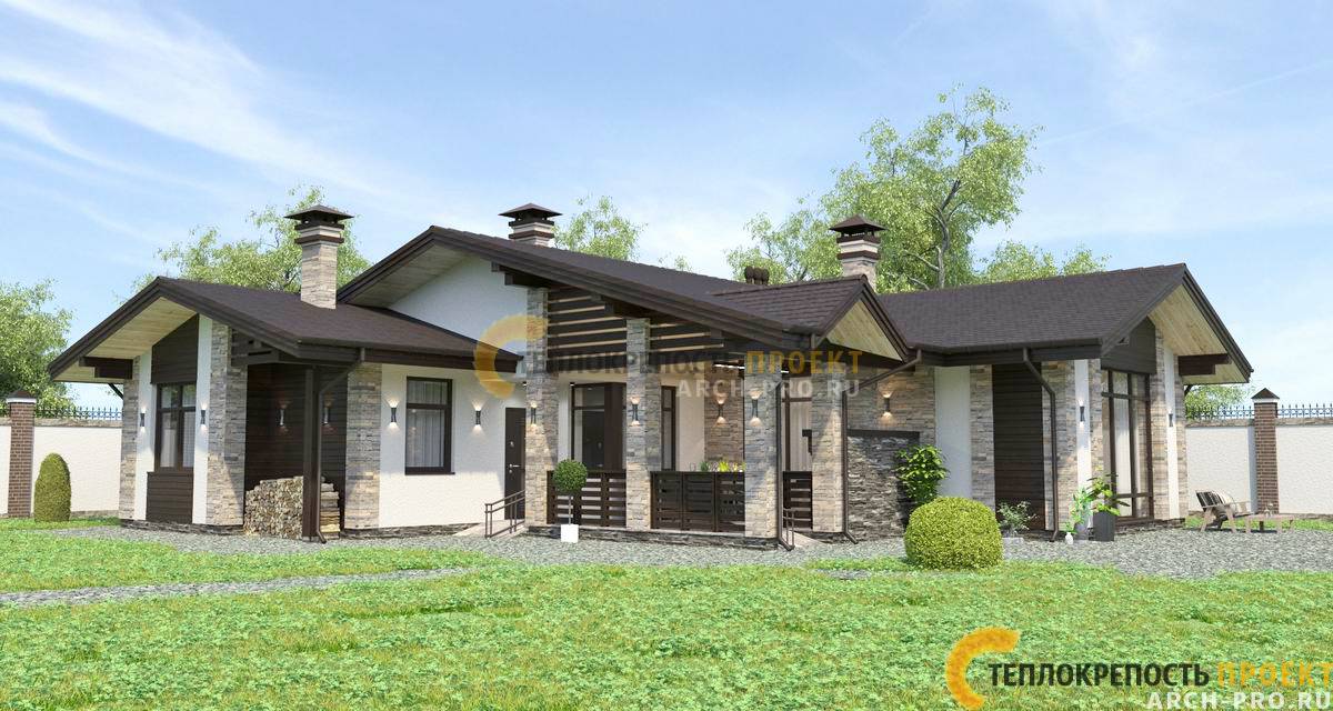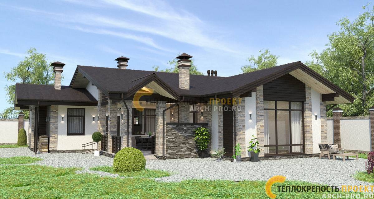 Скатная крыша покрыта черепицей элегантного цвета темного шоколада. Этот же оттенок повторяется и в колпаках дымоходов, облицованных светло-серым рваным искусственным камнем, а также в водосточных трубах, оконных и дверных рамах, деревянных элементах экстерьера.