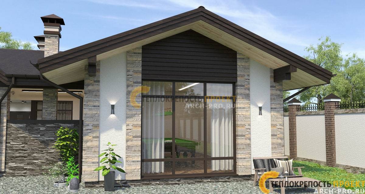 Снаружи стены в нашем проекте бани с бильярдом отделаны искусственным бетонным камнем и светлой декоративной штукатуркой. Такое сочетание придает ей свежий и нарядный внешний вид, в то же время, идеально гармонируя с дизайном экстерьера жилого дома. Скатная кровля покрыта гибкой черепицей аристократичного темно-коричневого цвета, а большие окна в рамах под дерево такого же оттенка успешно выполняют функцию обеспечения всех помещений естественным освещением.