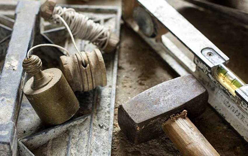 Для строительства барбекю понадобятся молоток, уровень, шлифмашина и строительный отвес