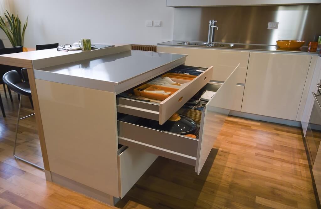 - системой хранения — открытыми и закрытыми полочками, выдвижными ящиками, бутылочницами, которые используются для хранения посуды, текстиля и других полезных мелочей;
