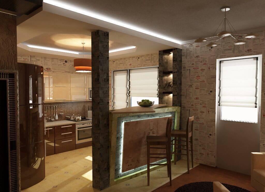 В квартирах, где кухня и гостиная объединены, такая стойка может стать незаменимым элементам обустройства и зонирования. Обычно более низкую сторону устанавливают со стороны кухни, а высокую — со стороны гостиной.