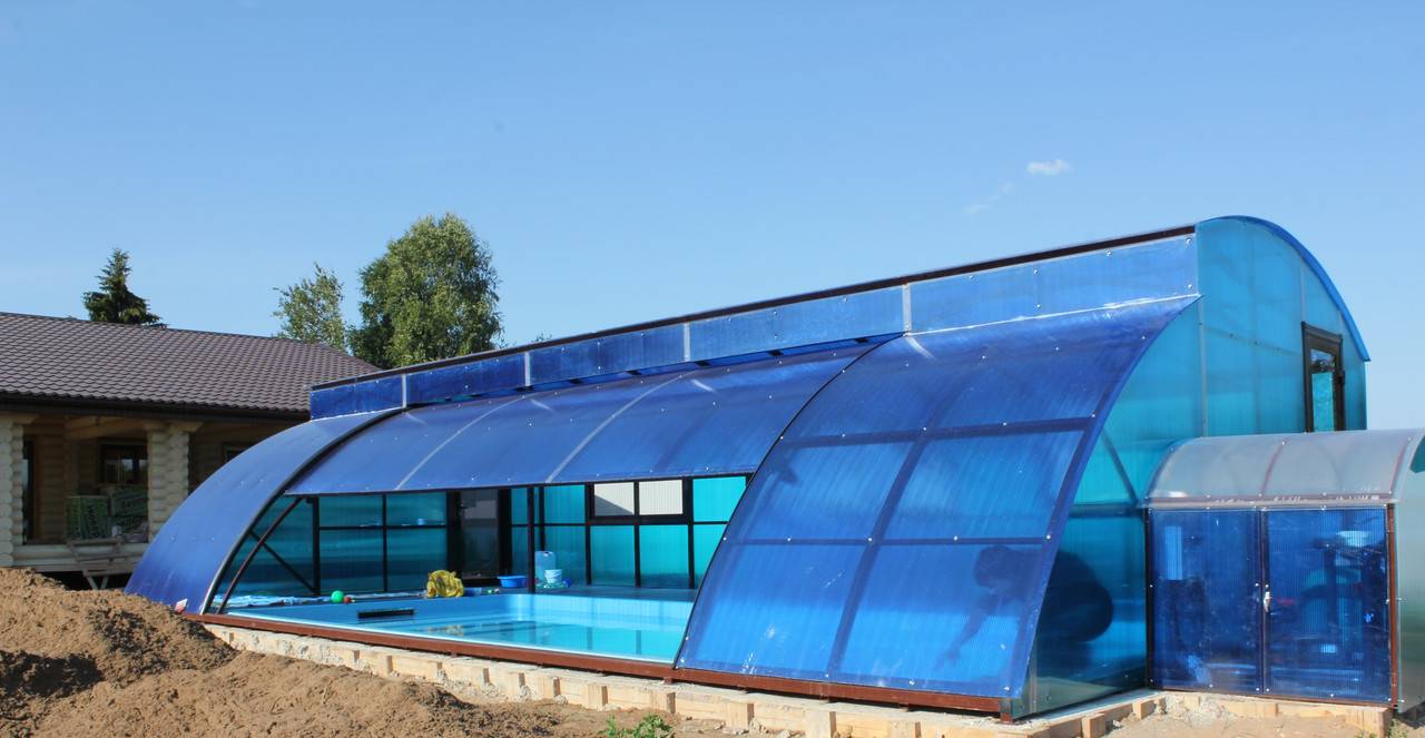 Более удобными и практичными являются закрытые павильоны, представленные как в виде традиционных теплиц, так и выполненные по индивидуальному дизайнерскому проекту. К таким конструкциям относятся куполовидные павильоны, устанавливаемые над круглыми бассейнами. Плюсом конструкций является их необычный внешний вид, благодаря которому сооружение может стать центральным элементом ландшафтного дизайна. К минусам относят сложности в возведении, которые заключаются в необходимости резки листового материала на сегменты.