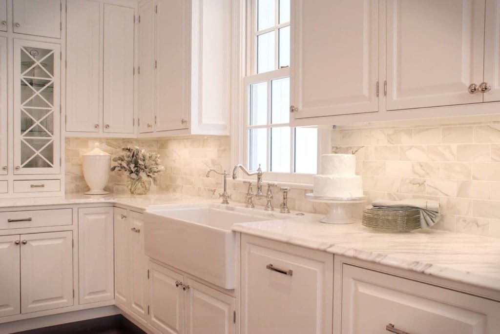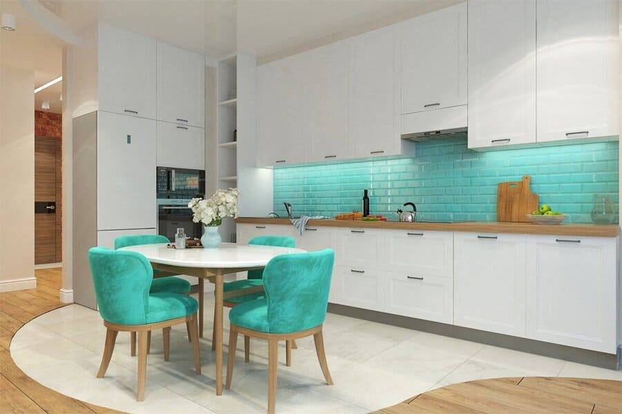 Несмотря на то, что белый цвет является своеобразной базой, и его можно отнести к категории светлых оттенков в палитре, крайне часто фартук в кухонном помещении оформляют в аналогичной цветовой гамме. В таком случае можно использовать идею с сочетанием двух фактур при отделке – если вся мебель внутри помещения будет матовой, то фартук стоит сделать глянцевым в светлом оттенке. Более того, рабочую зону на белой кухне достаточно часто оформляют в бежевых тонах при помощи мозаики или плитки. Деревенский стиль будет допускать применение нежных оттенков зеленого, бирюзового или голубого. В тренде также песочные и кремовые оттенки материалов для отделки стен.