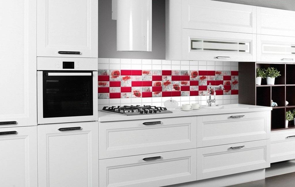 Считается, что красный – цвет, притягивающий к себе максимум внимания. Белый+красный – красивое сочетание, но использовать его надо аккуратно. Он разжигает аппетит, а в переизбытке даже способен утомить присутствующих в таком помещении с таким интерьером. Помните об этом, когда будете решать, какого цвета фартук подойдет к вашей белой кухне.