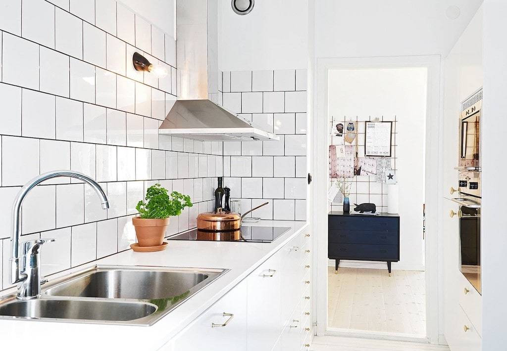 Кухни, в которых столешница белая – какой фартук подойдет для них? Такой приём типичен для интерьеров в стиле Сканди. Фартук здесь тоже белый, чаще всего оформлен плиткой. Если и есть контраст, то это деревянная столешница.