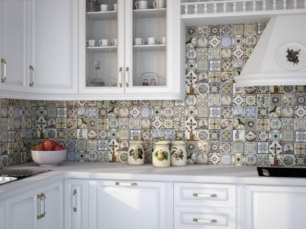 Белая мебель будет сдерживать неукротимую энергию узоров в испанском стиле. Красоту рисунка подчеркнут фурнитура и декоративная посуда, а белизна других элементов интерьера будут отличным фоном для красивого узора.
