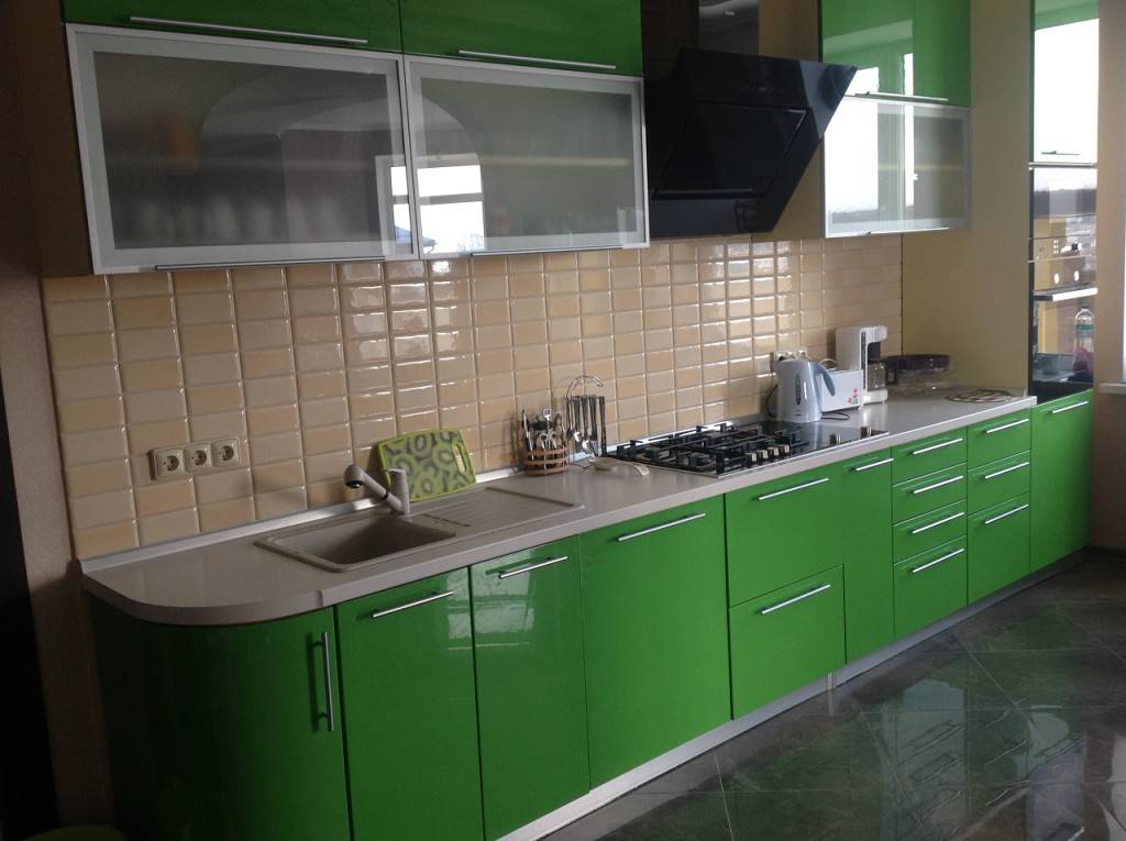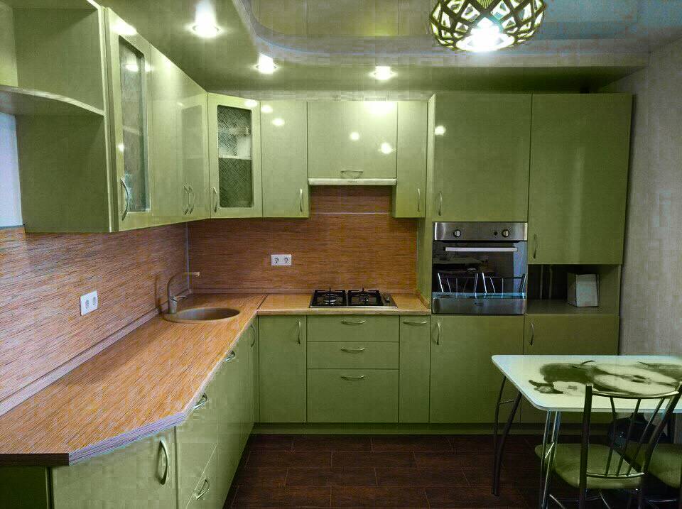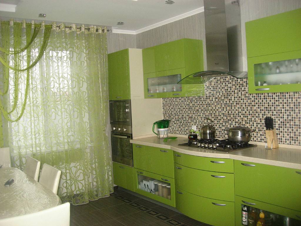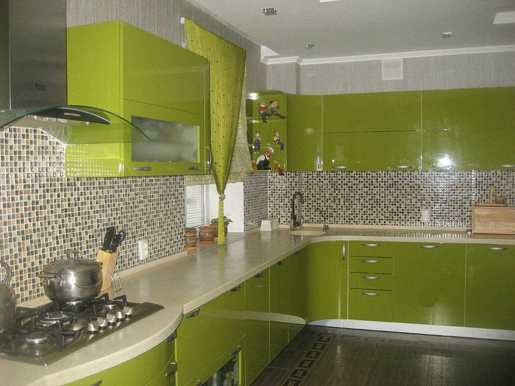 Это очень яркая кухня, если цвет насыщенный. Лучше, конечно, выбирать или оливковые, или фисташковые цвета мебели.