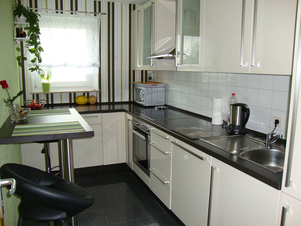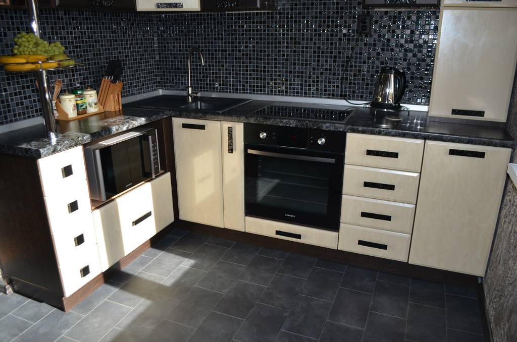 - Черный цвет беспроблемно сочетается с большинством существующих красок. Часто кухни с такими столешницами дополняют различными декорациями разных цветов. В итоге получаются очень интересные и свежие решения.