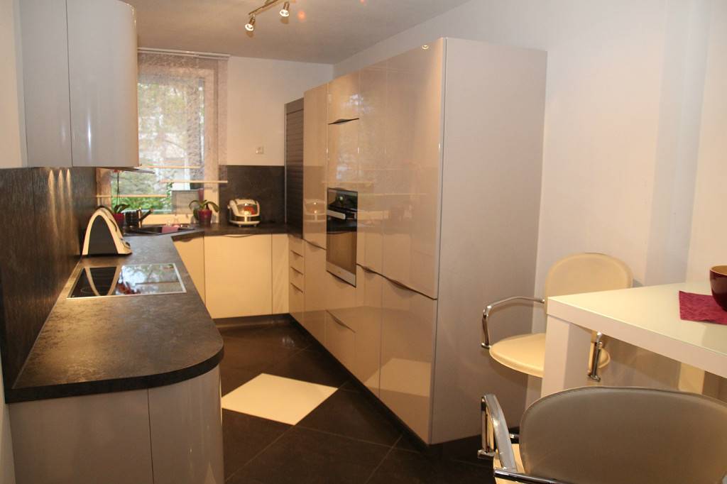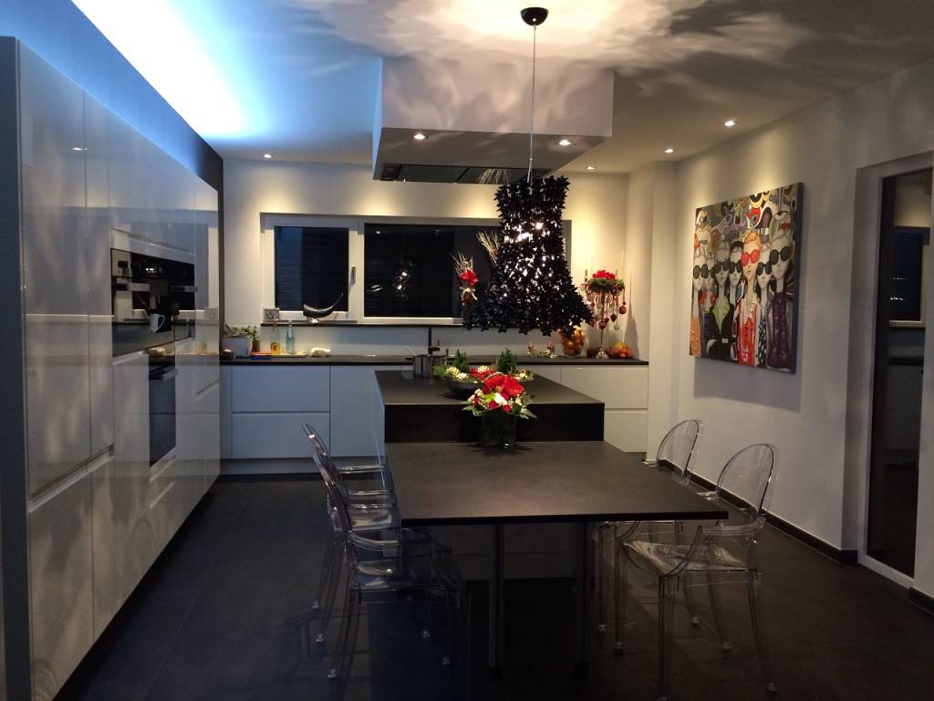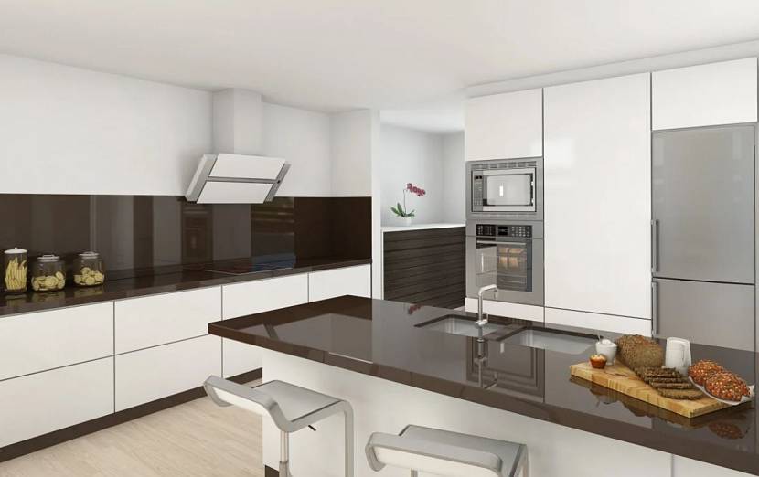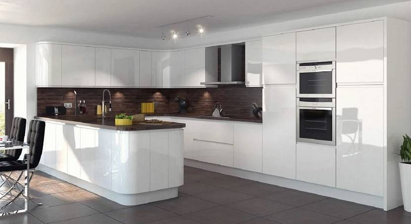 В отличие от предыдущих вариантов, модерн в белой кухне подразумевает наличие глянца. Сразу после входа в помещение должно создаться впечатление обилия естественного освещения. Достигается это следующим образом: