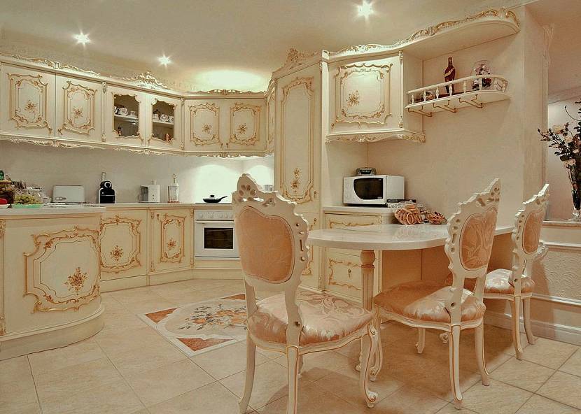 Торжественный, элегантный и благородный стиль. Для такой кухни необходимо большое помещение с высокими потолками. Нежный розовый цвет удачно сочетается с позолоченными элементами.