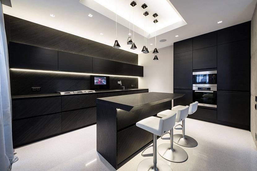- Черная кухня будет намного лучше выглядеть, если ее объединить с гостиной или сделать проходной.