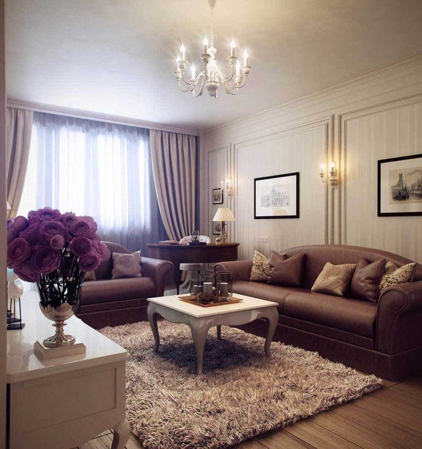 В гостиной комнате в классическом стиле уместна установка дивана и роскошных кресел со светлой кожаной или тканевой обивкой в бежевых, коричневых или серых цветах. Для дизайна также подойдет вместительный комод и крупногабаритные деревянные шкафы с зеркальными или стеклянными фасадами.