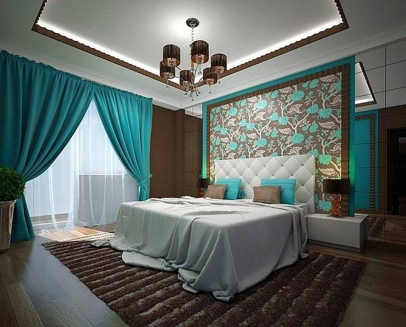 Один из самых удачных дуэтов. Комбинация теплого кофейного и цвета морской волны привносит в интерьер атмосферу изнеженной роскоши. Сочность темного коричневого подчеркивает благородный бирюзовый. Теплоту или холодность дизайна корректируют основным фоном. В просторной спальне можно использовать шоколадное оформление. В компактном уместны прозрачные оттенки сине-зеленого.