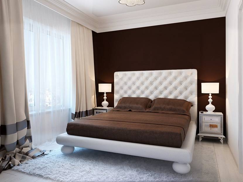 Темное оформление стен коричневой спальни с белыми фасадами смотрится эффектно и ярко. Снежные предметы интерьера оптически добавят пространству освещения, как окна. Кофейной можно оформить одну акцентную поверхность в зоне с кроватью.