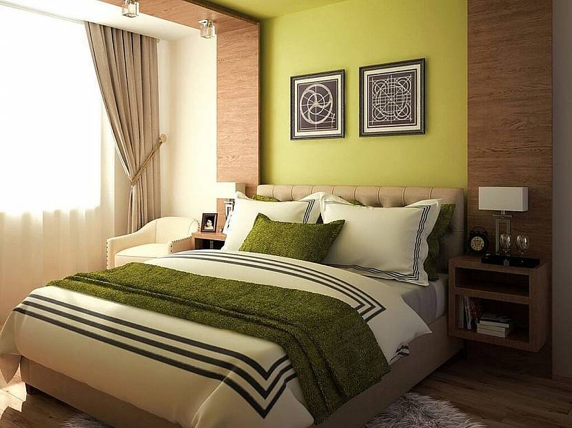 Текстиль, настенная отделка или напольное покрытие в спальне могут быть фисташкового цвета.