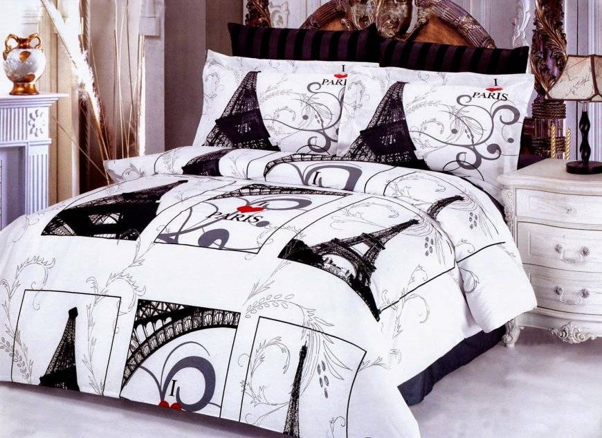 Громоздкая мебель будет лишать пространство легкости. Атмосфера будет излишне давящей, поэтому лучше подбирать встраиваемые варианты. Шкафы и другие габаритные предметы лучше подбирать в светлых тонах. Хотя интересно будет смотреться черно-белая мебель в спальне. Чтобы связать мебель с общей идеей можно использовать модели, имеющие принты и узоры.