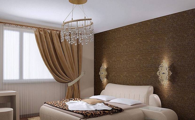 В большой комнате дизайнеры разрешают использование темного заднего плана и светлой мебели. Бежевая кровать смотрится очень большой и парящей над полом. Сочетание коричневых и песочных стен позволяет визуально корректировать неправильность вытянутой (прямоугольной) спальни.