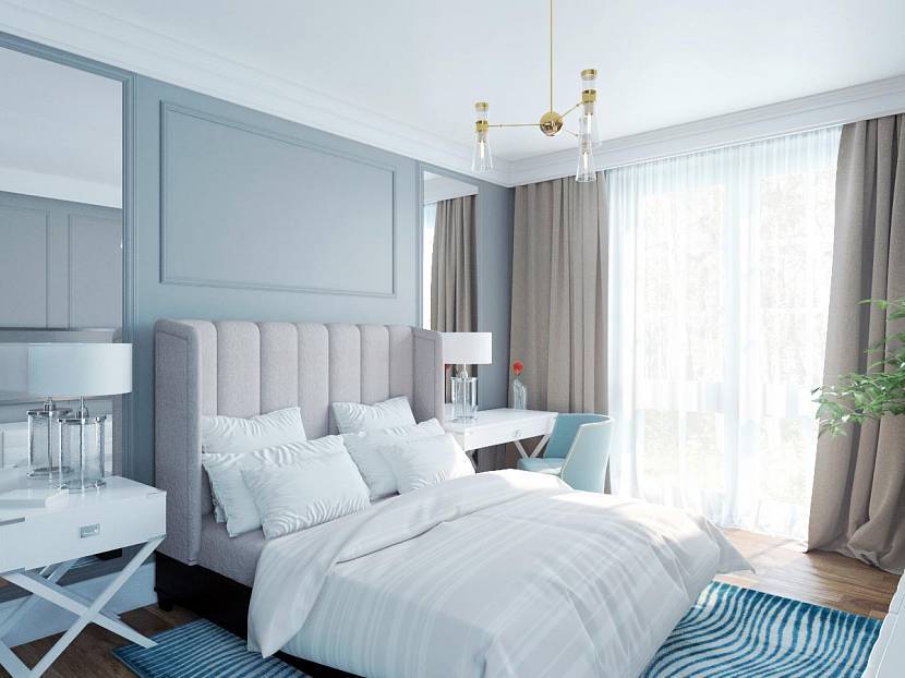 Однотонная синяя спальня разбавлена серыми портьерами и кроватным покрываломИсточник suncityvillas.com