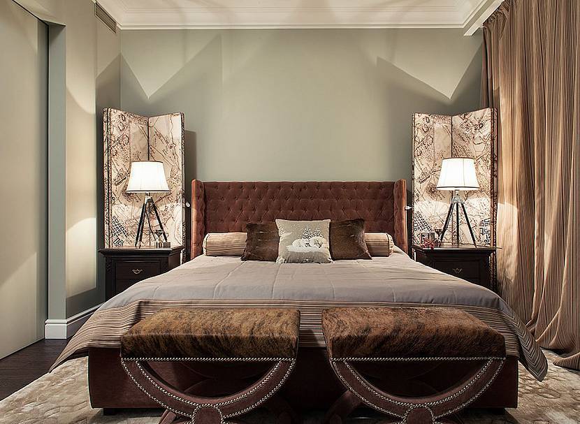 Темная спальня в коричневых тонах эффектно выглядит с фоном, выполненным в сочных природных оттенках. Пространство психологически воспринимается свежим, чистым и естественным. Полупрозрачные бледные цвета (фисташковый, серый мох) более выигрышны, чем белый или бежевый. Интерьер получается живым, объемным и подвижным.