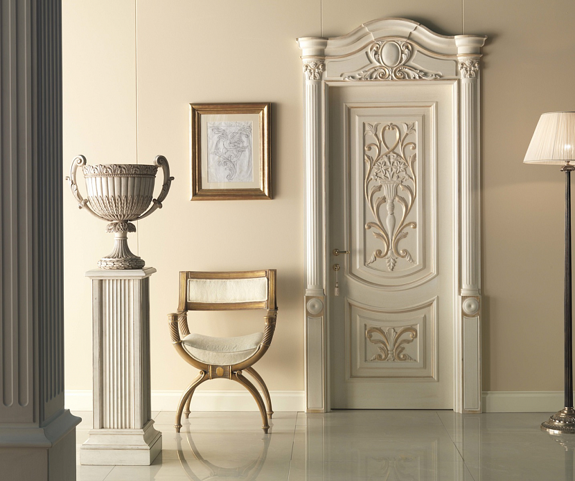 Ампир, барокко. Здесь не обойтись без роскошно декорированной дверной конструкции: с лепниной, резными деталями, вычурной фурнитурой, золотой или серебряной патиной.