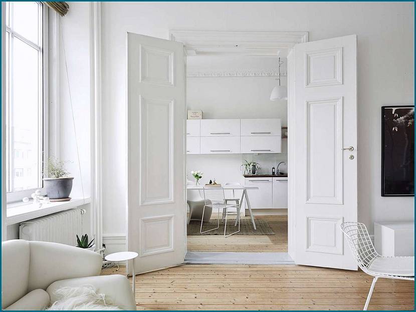 Белые стены, белые двери. Такой вариант наиболее логичен, а потому встречается часто, как в классических, так и в современных стилевых решениях. Если все помещение выполнено в белом цвете, белая дверь на белом фоне станет лучшим способом поддержать общую картину.