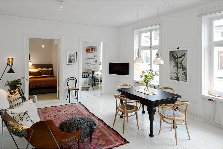 Белый цвет в этом случае поддерживает ощущение чистоты, а народные узоры, этнические предметы создают чувство дома, непринужденную атмосферу.