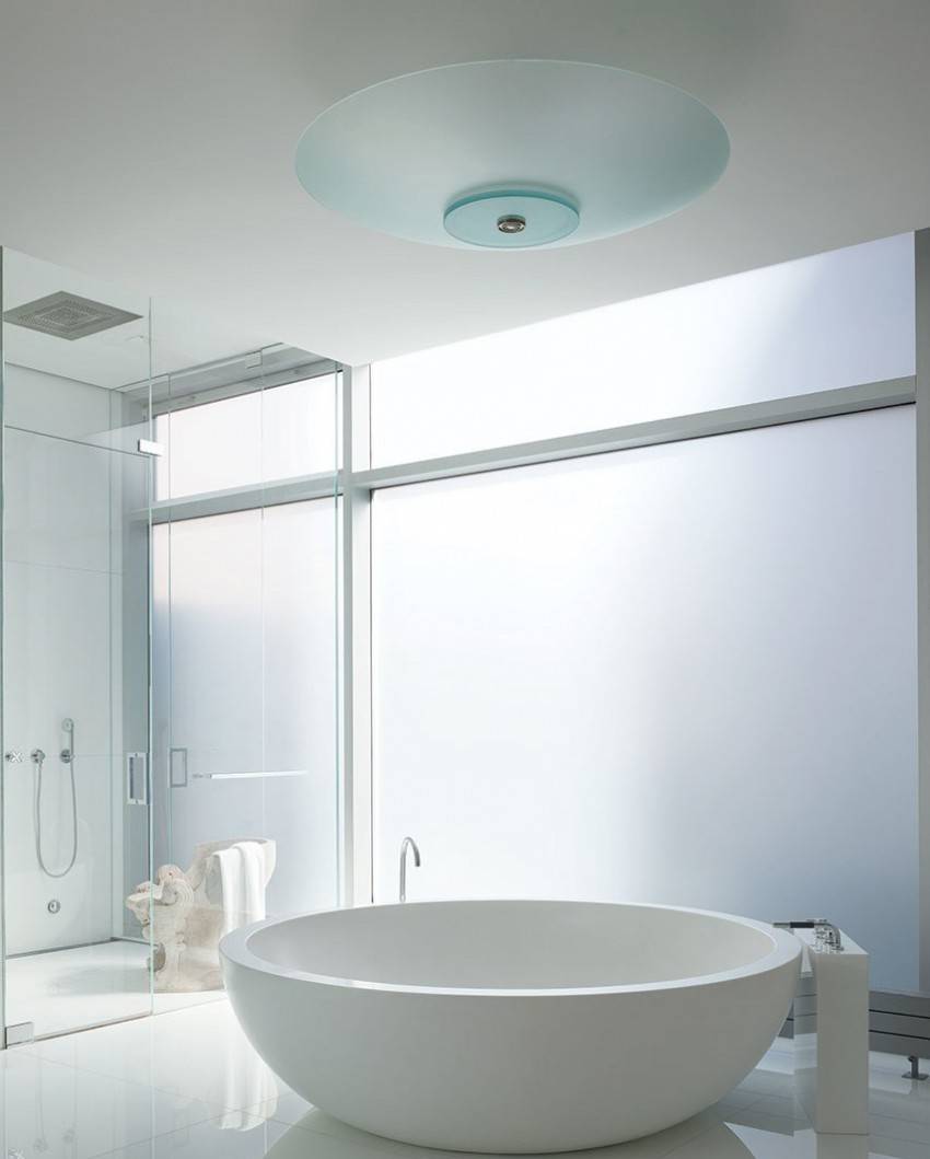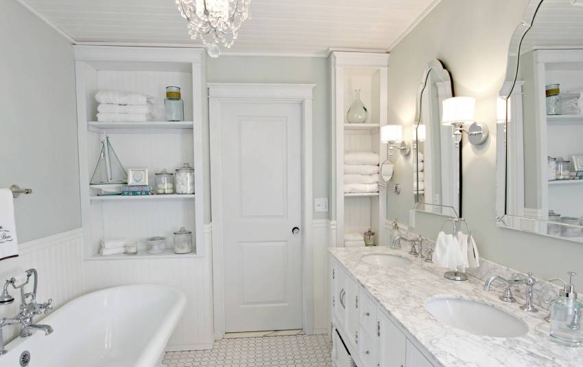 Массивный или яркий светильник лучше не выбирать – красивые ванные комнаты в белых тонах смотрятся более гармонично, когда по бокам располагаются точки встроенных ламп, а посредине устанавливается прозрачный прибор любого, но не навесного типа.