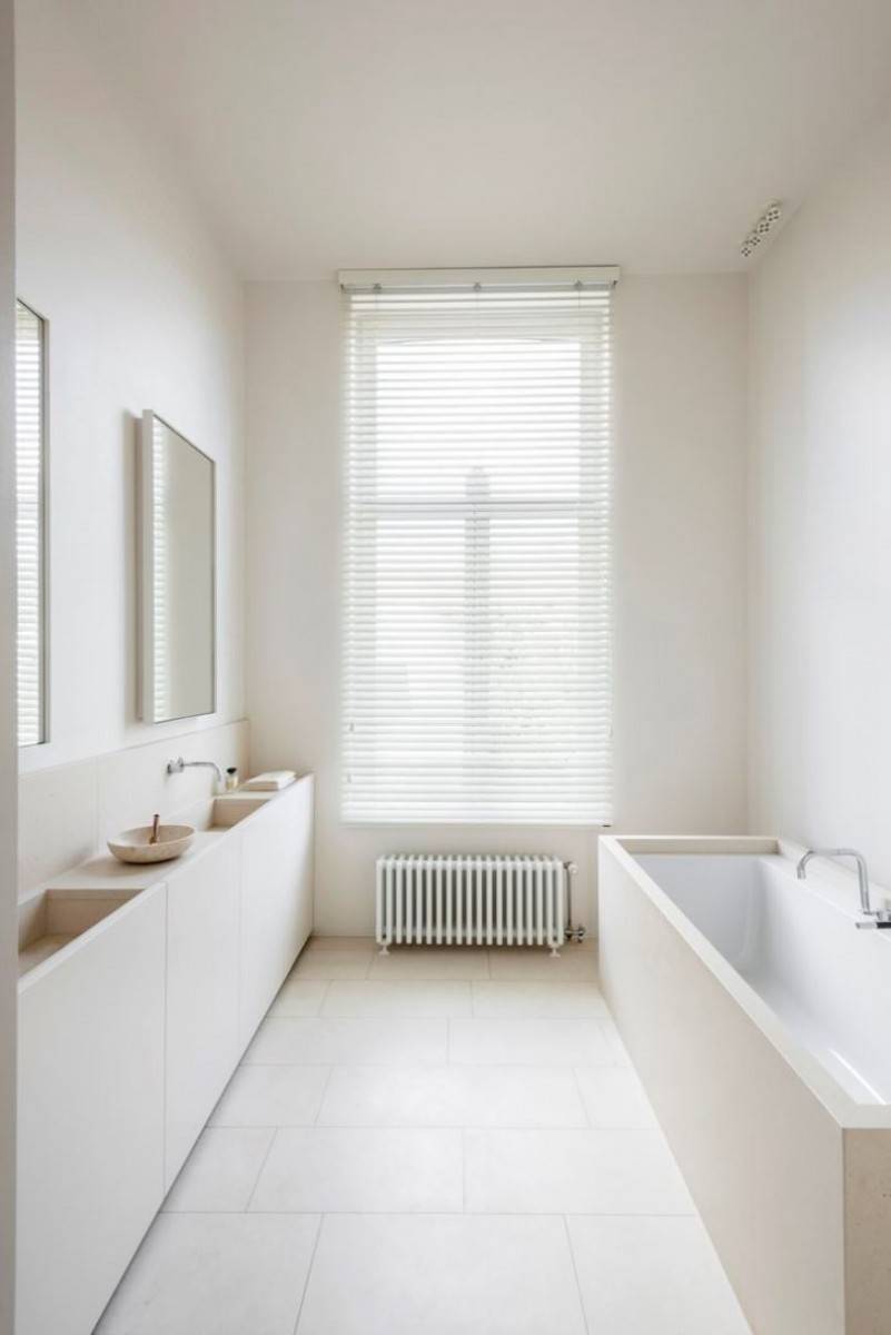 В целом интерьер белоснежной ванной можно выполнить в каком угодно стиле с применением почти любых материалов. Главное избегать излишней «белоснежности» и монохромности, дополняйте комнату цветными аксессуарами и различными фактурами.