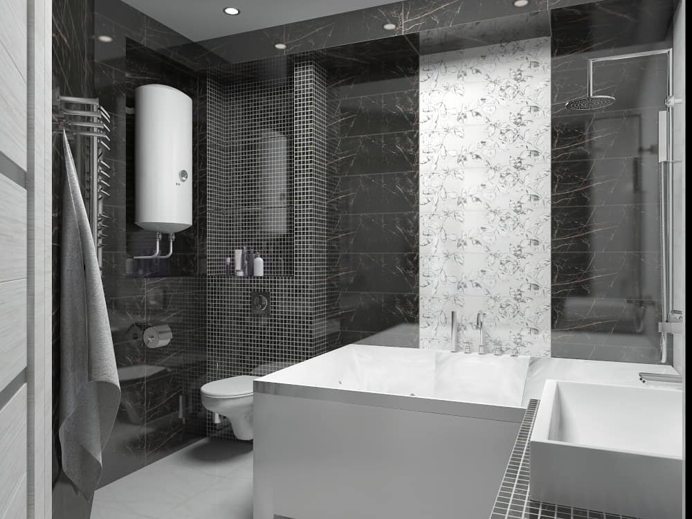 Дизайн черно-белой душевой комнаты с акцентной стеной.