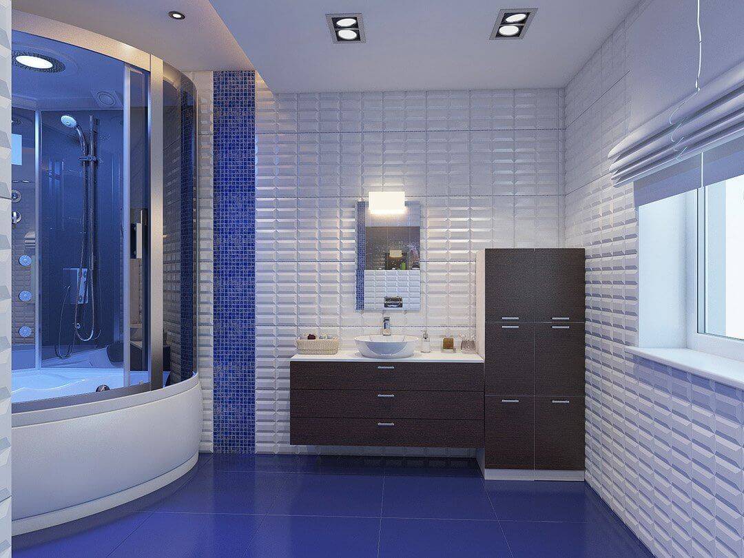 Интерьер сине-белой умывальной, отделанной плиткой.