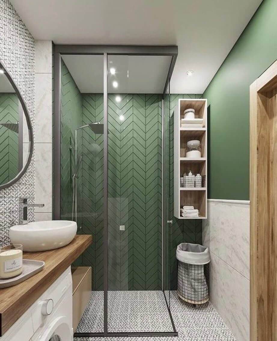 Зеленый цвет безотносительно к оттенку освежает дизайн. Будет ли это сочная зелень, драгоценный изумруд или мята – решать вам. Приверженцам эко-стиля будет интересна идея размещения живой растительности, привычной к влаге, в помещении. Автополив при этом осуществляется за счет специальной водоотводящей системы.