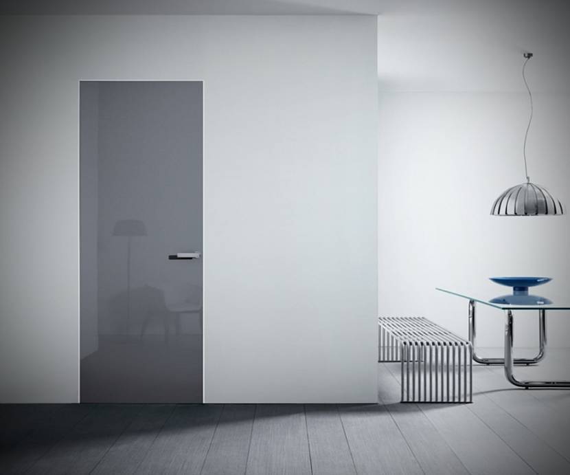 Глянцевая серая дверь в лаконичном интерьереИсточник dveri-academy.ru