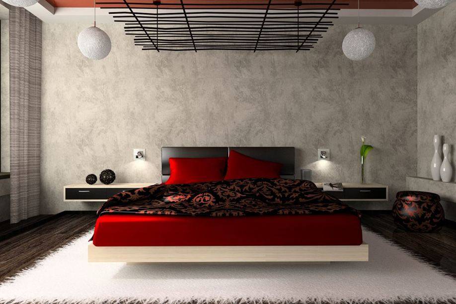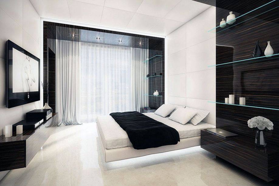 При оформлении спальни в стиле хай-тек дизайнеры чаще всего отдают предпочтение нейтральным цветам: черному, белому или серому, прекрасно контрастирующим с красным цветом, часто применяемым в качестве акцента.