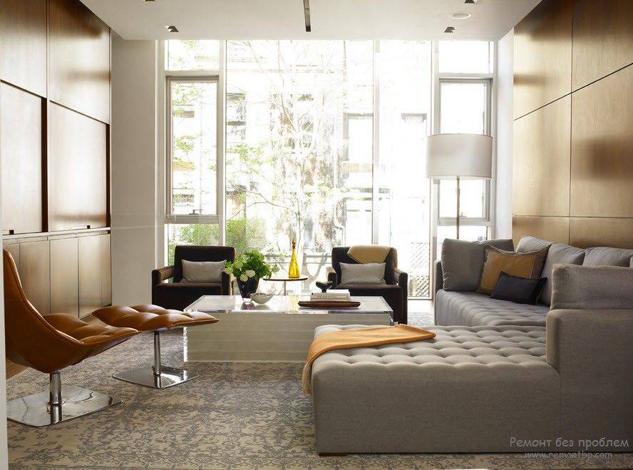 - дополнением такой мебели будут кресла с темной обивкой. Они не должны бить идентичны дивану, их могут объединить другие предметы декора.
