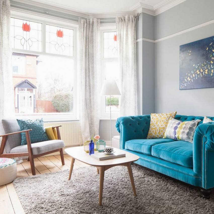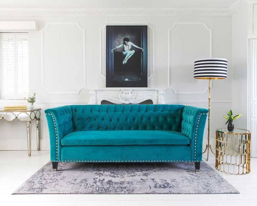 Достаточно оригинально будет выглядеть диван цвета электрик на фоне желтых или ванильных стен. Для дополнительного декора можно использовать небольшие подушки, мелкие детали, типа рамок для картин, подсвечников.