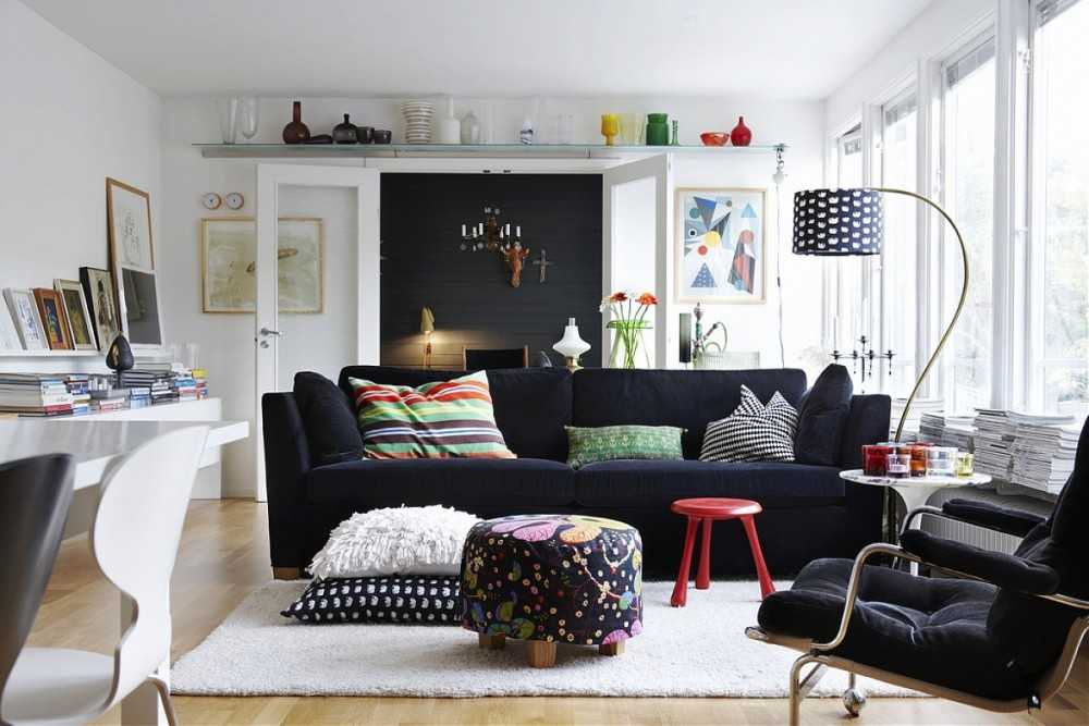 Если вы не любитель стилизовать комнату под что-то определенное, то черный диван отлично подойдет для смешивания стилей. Превратит помещение в более стильное и солидное.